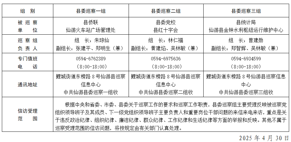 根据党中央关于巡视巡察决策部署及省委、市委、县委工作要求,经县委巡察工作领导小组决定,从4月下旬开始,县委巡察组对县委党校、县统计局、县侨联、县红十字会、仙游火车站广场管理处、仙游县金钟水利枢纽运行维护中心开展巡察。巡察时间为40天左右。目前,巡察组已经进驻巡察。