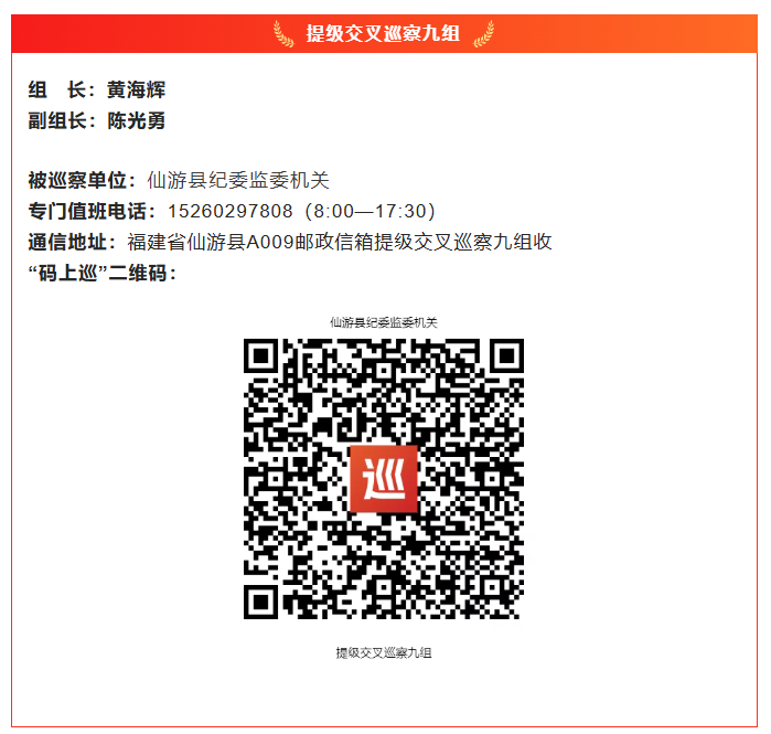 市委提级交叉巡察九组将在县纪委监委机关工作30天左右。巡察期间设专门值班电话:15260297808;每天受理电话的时间为8:00-17:30,邮政信箱:仙游县A009邮政信箱;也可扫描下方二维码登录“福建巡视巡察‘码上巡’”小程序反映问题。市委提级交叉巡察九组主要受理反映县纪委监委领导班子及其成员、县委管理的其他干部及下一级主要负责人、重要岗位领导干部问题的来信来电来访,重点是关于违反政治纪律、组织纪律、廉洁纪律、群众纪律、工作纪律和生活纪律等方面的举报和反映。其他不属于巡察受理范围的信访问题,将按规定由县纪委监委机关和有关部门认真处理。