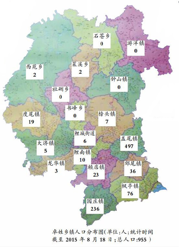 根据2016年7月印发的《福建莆仙卓氏》中记载,目前我县卓氏人口主要聚居在盖尾镇东井宫卓厝、南宝峰上湖、东许北厝、后井卓厝,园庄镇岭北,郊尾镇梅塘,枫亭镇霞街社区,度尾镇埔尾和屏山等地。