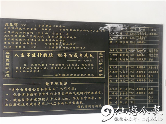 在辉煌村,老一辈人中不少都有旅台经历,很多人在生活条件好转后便回了家乡,却也有一些人因为特殊原因在当地定居下来。但乡情却非距离可以斩断,在钟氏宗祠钟的墙壁上刻着一方石碑,记述着在台定居的族人钟玉辉的经历。