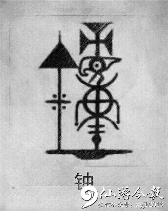 钟是由“俞表”和“重仪”合成。左边为俞表,是用来确定方向的。右边的“重仪”由“辛”、“东”、“目”、“土”组成。“辛”是设立的风向标,“目”表示人的眼睛。璇玑盘用来辨别方位。“土”表示璇玑盘所立的地方。由此可见,钟姓图腾实际上是一个观测天文,推演历法的仪器。